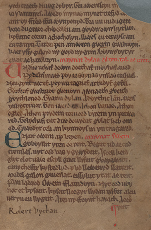 Mae Marwnad Owain yn dechrau naw llinell o’r gwaelod ac fe welwch lythyren wyrddlas i air cyntaf y gerdd, sef Eneit ‘enaid’. Ar ochr dde’r un llinell mae’r teitl wedi’i ysgrifennu ag inc coch. Mae’r testun yn parhau ar yr ail dudalen.